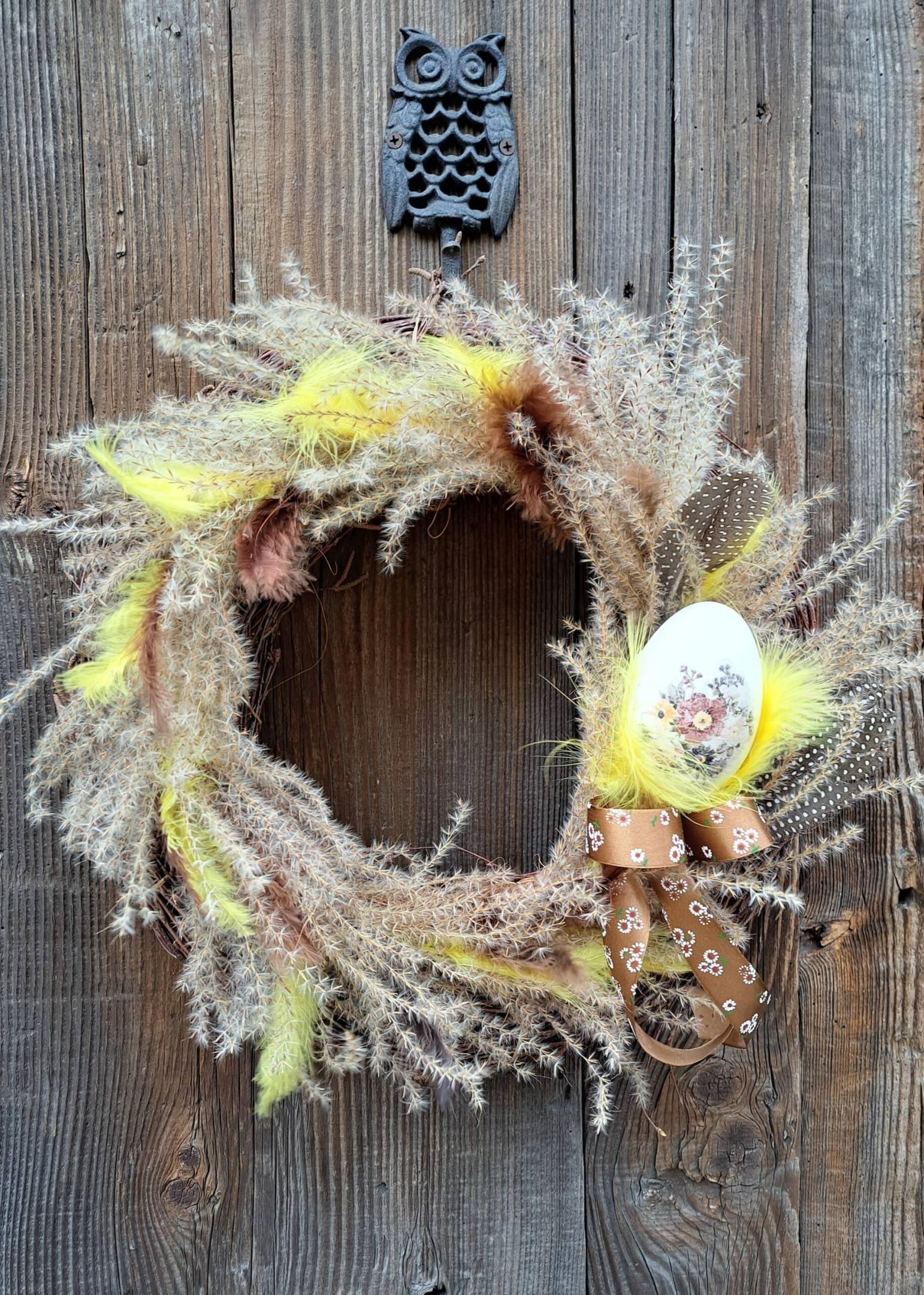 - Przypięty jest do niego osobny wianek z puchatymi trawami, piórkami, ozdobiony gęsim jajem piórami perliczki. To naturalna wydmuszka zdobiona metodą decoupage.